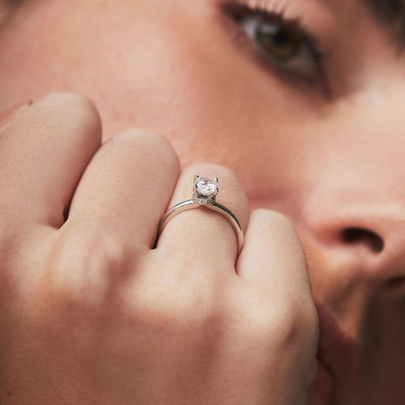 Un anillo Hidden Halo incorpora una hilera de pequeños diamantes que rodean la canasta o base del diamante central, justo debajo de las uñas que lo sujetan.
