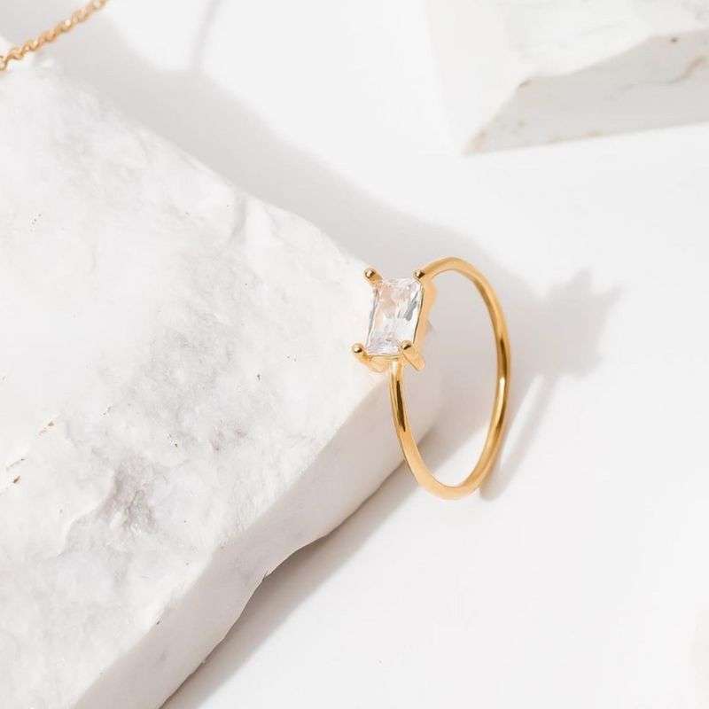 Anillo de plata 925 con circonia rectangular. Disponible en baño de oro amarillo de 24k de 1 micra y con circonias color rosado, verde, morado y blanco.