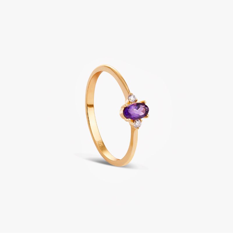 Anillo de oro amarillo 18k con amatista / zafiro y dos diamantes de 1.5pts.
