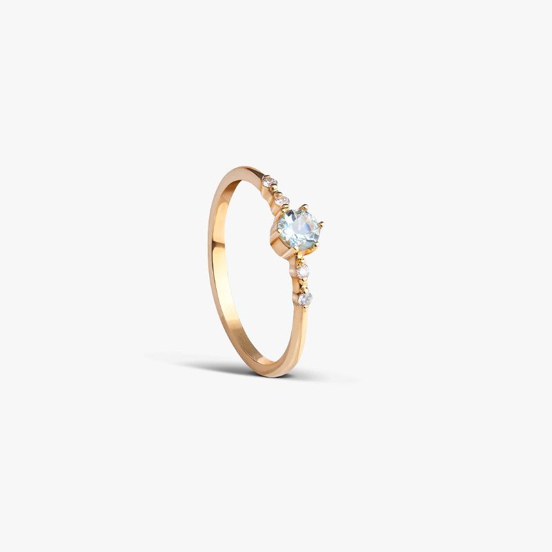 Anillo de oro amarillo 18k con aguamarina de 3.5mm y cuatro diamantes de 1.5pts.