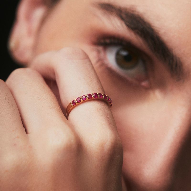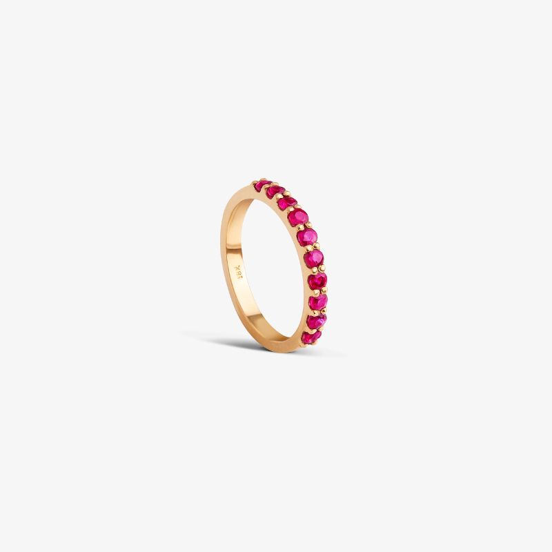 Anillo cintillo de oro amarillo 18k con 10 rubíes de 0.04ct (2.25mm aprox) cada uno.