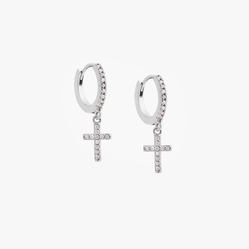 Aretes de plata 925 cruz colgante con zircones. Shop online en adriajoyas.com. Disponible en plata y bañado en oro 24k.