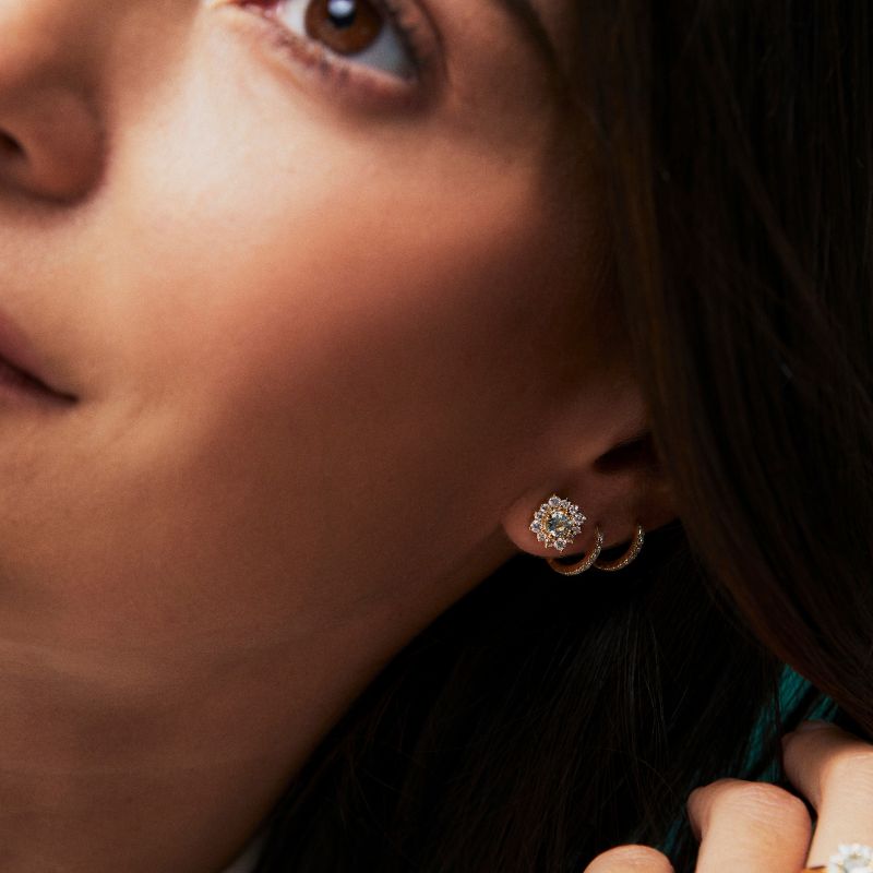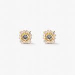 Aretes de plata 925 modelo roseta con aguamarina de 4mm y zafiro blanco 2mm/1.5mm. Disponible en plata y bañado en oro amarillo.
