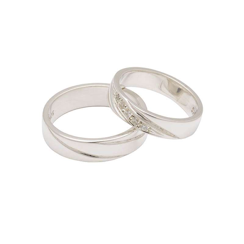 Alianzas de matrimonio con acabado liso y detalle diagonal con 5 puntos de luz. Disponible en oro blanco 18k, oro amarillo 18k y oro rosa 18k.