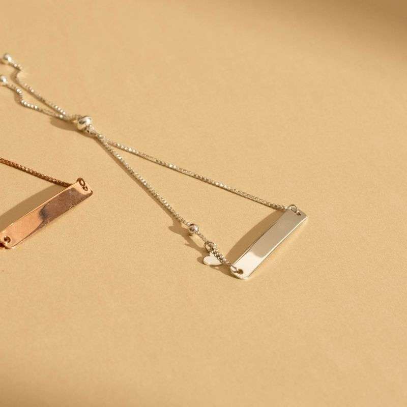 Pulsera ajustable de plata con placa para personalizar con motivo de corazón al costado. Disponible en baño de oro rosa y amarillo de 24k de una micra.