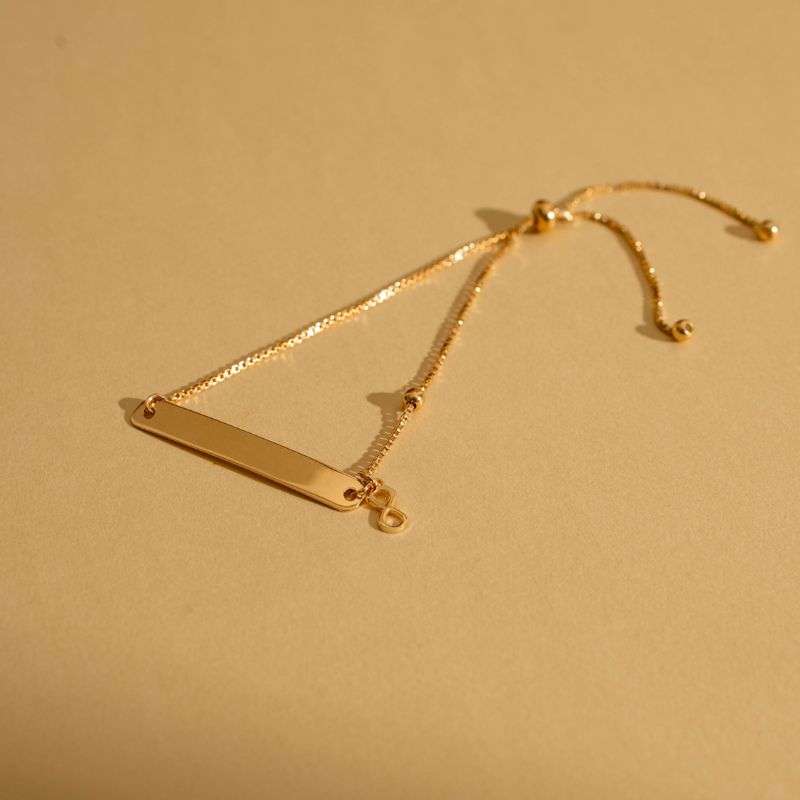 Pulsera ajustable de plata con placa para personalizar con motivo de infinito al costado. Disponible en baño de oro rosa y amarillo de 24k de una micra. El 10% de las ventas de este producto durante el mes de Diciembre 22 y Enero 23 será donado a la ONG Plan Internacional.